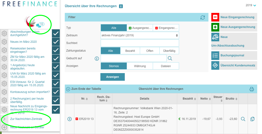 FreeFinance eignet sich ideal für eine gemeinsame Zusammenarbeit an der Buchhaltung mit Ihrer Steuerberatung. Unsere "Integrierte Kommunikation" stellt die Verbindung des Kommunikationsmanagements und der Geschäftsfälle dar.