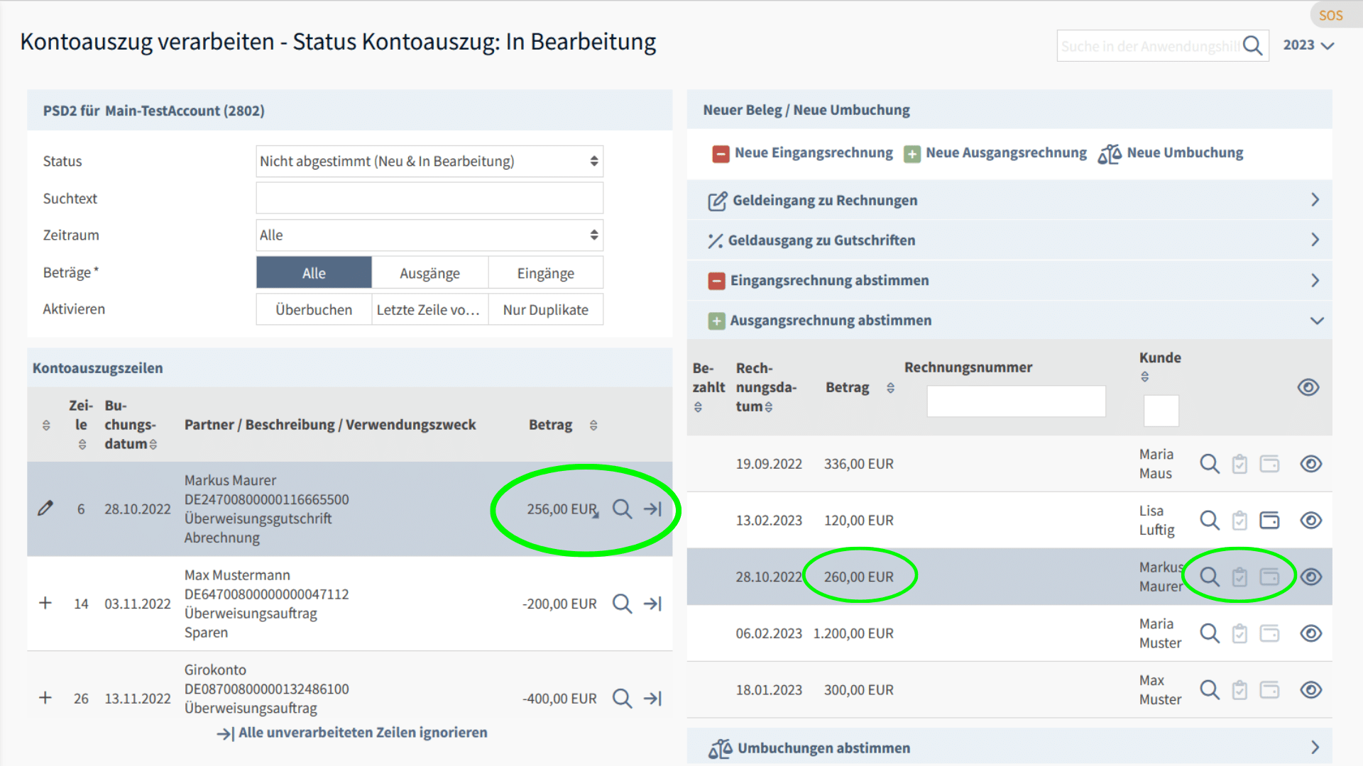 Der Geldeingang zur Ausgangsrechnung in der Rechnungslegung kann automatisiert über das Mapping anhand von Kunde bzw. Rechnungsnummer erkannt werden - Wenn Sie Ihre Ausgangsrechnungen in Drittsystemen führen: Die Ausgangsrechnungen unter "Meine Belege" werden anhand entsprechender Vorlagen angelegt.