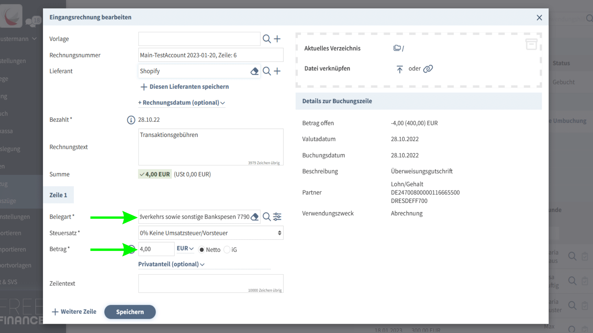 Sie erstellen nun parallel für jede gerade angelegte Ausgangsrechnung für die Spesen eine Eingangsrechnung mit der Belegart Spesen des Geldverkehrs und Bankspesen über den verbleibenden Betrag der Kontoauszugszeile.