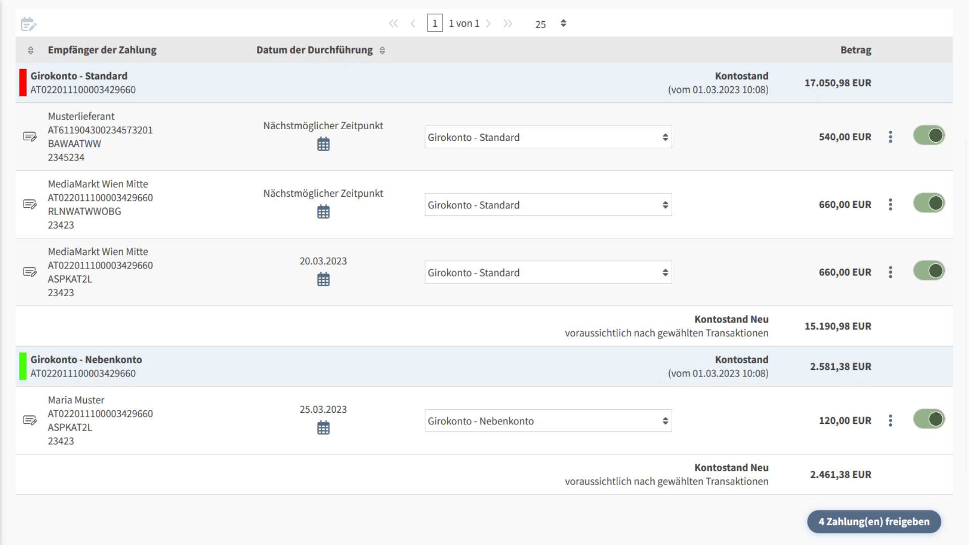 Über die Schaltfläche am rechten Rand können Zahlungen zur Freigabe aktiviert werden.