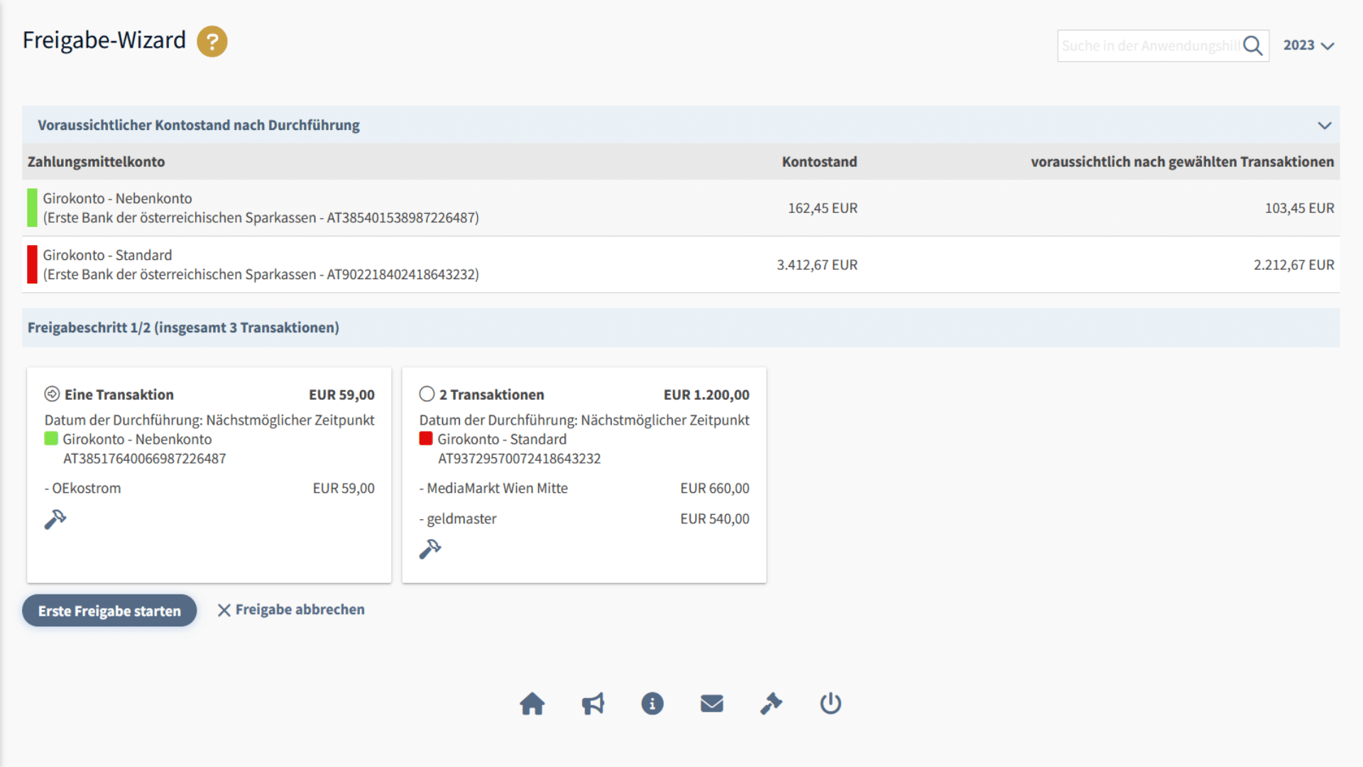 In den obersten beiden Zeilen erhalten Sie einen Überblick über alle den zur Freigabe aktivierten Zahlungen zugeordneten Bankkonten/Zahlungsmittelkonten. Der aktuelle Kontostand aufgrund des letzten Abrufs des Kontoauszugs, sowie der erwartete Kontostand nach der Durchführung der Transaktionen werden angezeigt. Der tatsächliche Kontostand nach der Transaktion kann von dem erwarteten Kontostand abweichen, wird das betreffende Konto anderweitig ebenso verwendet.