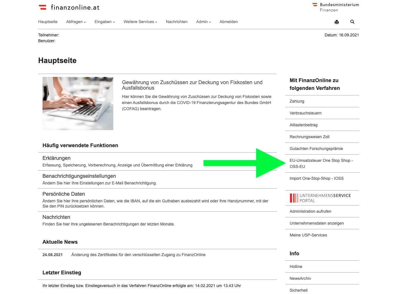 Elster stellt eine Funktion EU-OSS-Meldung zur Verfügung, für die Sie registriert sein müssen.