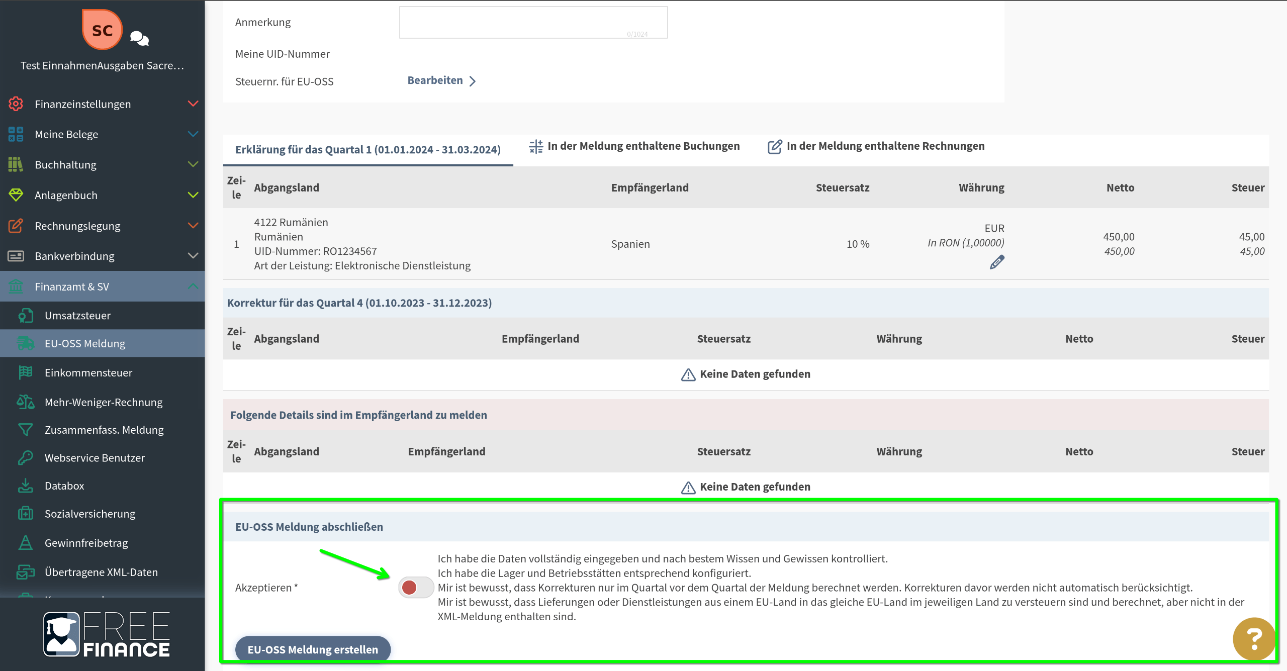 Mit FreeFinance können Sie die nötige EU-OSS-Meldung im XML-Format generieren.
