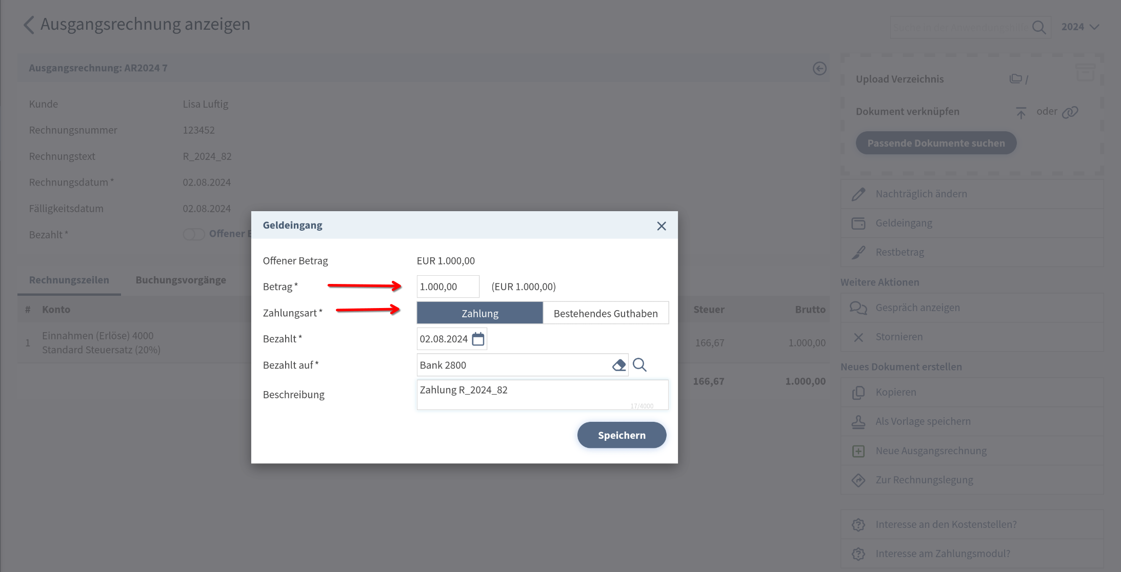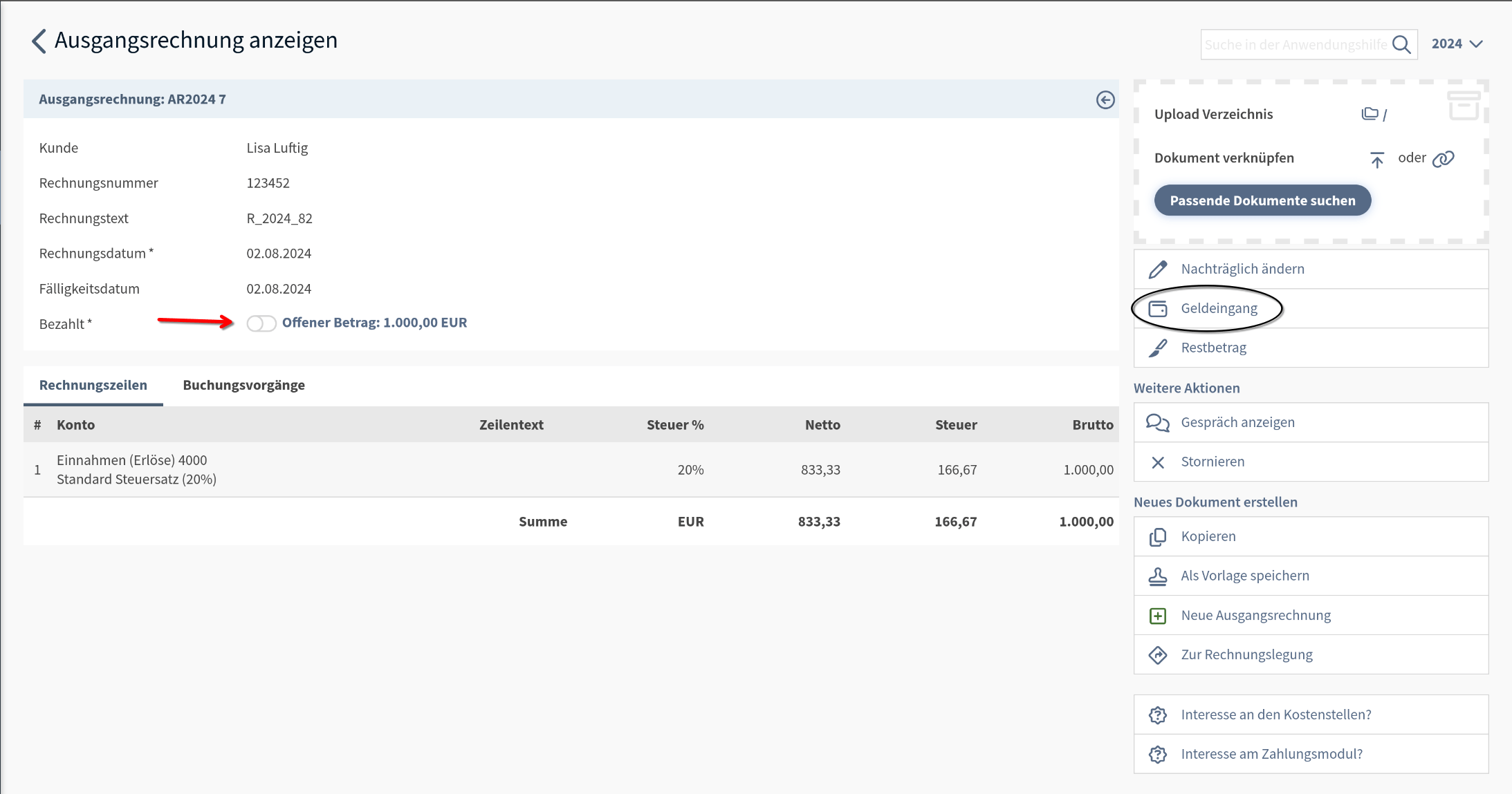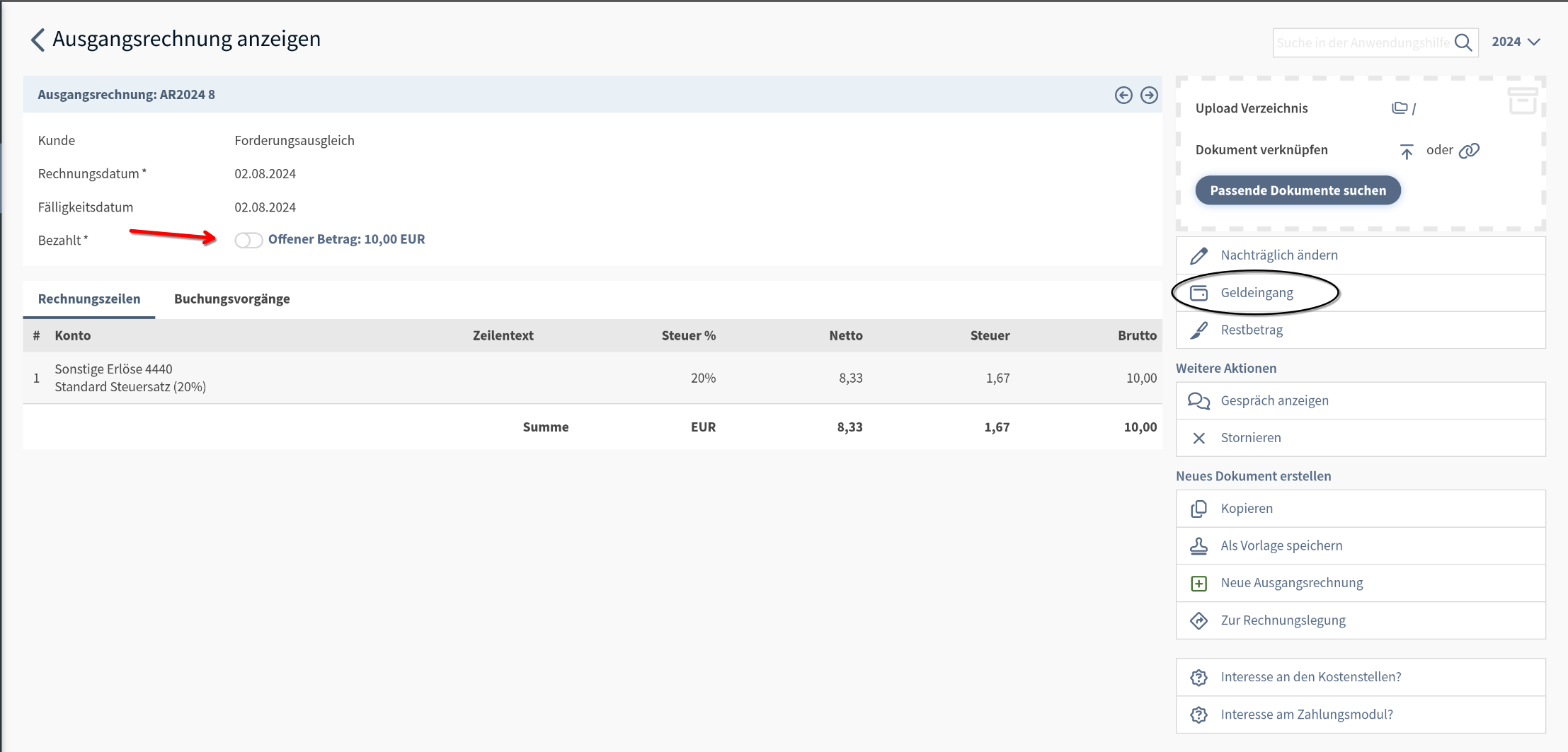 Wurde die Ausgangsrechnung beglichen und der Zahlungseingang nicht automatisiert über den Kontoauszug erfasst, sehen wir den restlichen offenen Betrag, sowie die Schaltfläche "Geldeingang".