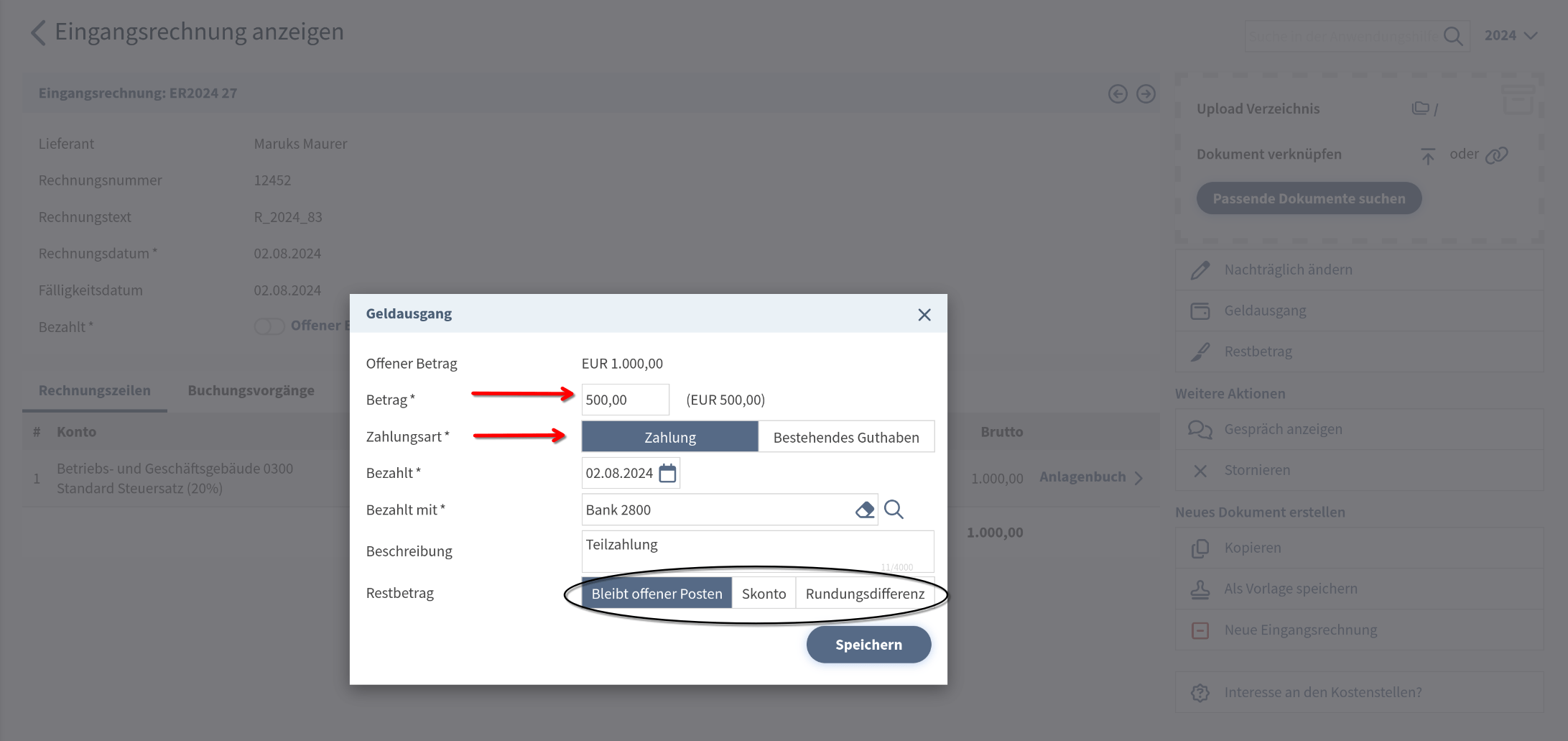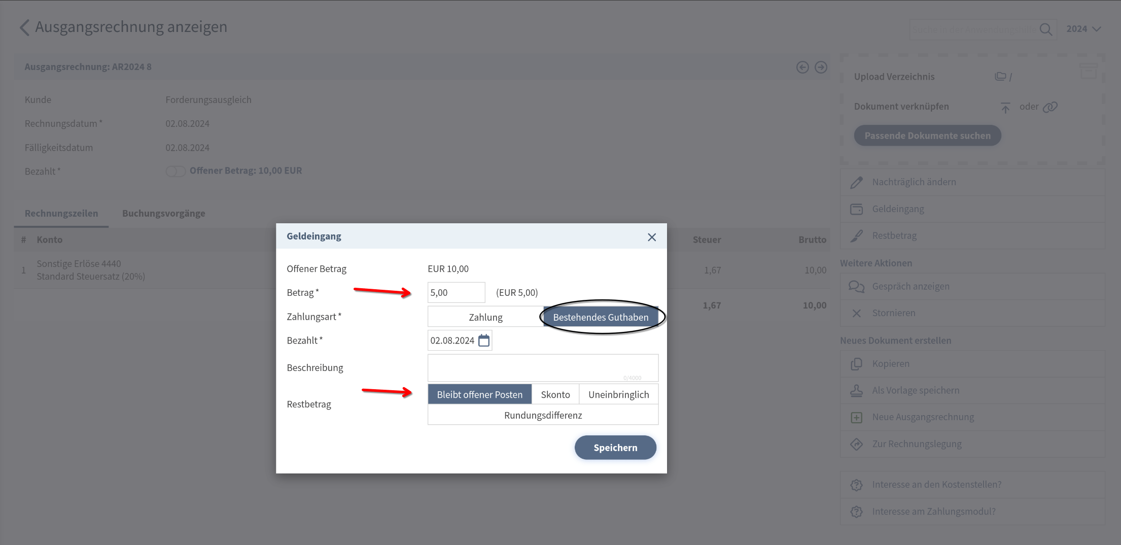 Entsprechend der Höhe des Guthabens, also einer Abdeckung der vollen Forderung/Verbindlichkeit oder nur eines Teils davon, gibt es wieder eine Wahlmöglichkeit wie der restliche Rechnungsbetrag verbucht werden soll. Reicht das Guthaben nicht aus, um den gesamten Betrag auszugleichen und werden ansonsten keine Sonderkonditionen wie Skonti angewandt, sondern die Rechnung durch eine Zahlung geschlossen, bleibt der restliche Betrag wieder als "Offener Posten" bestehen.