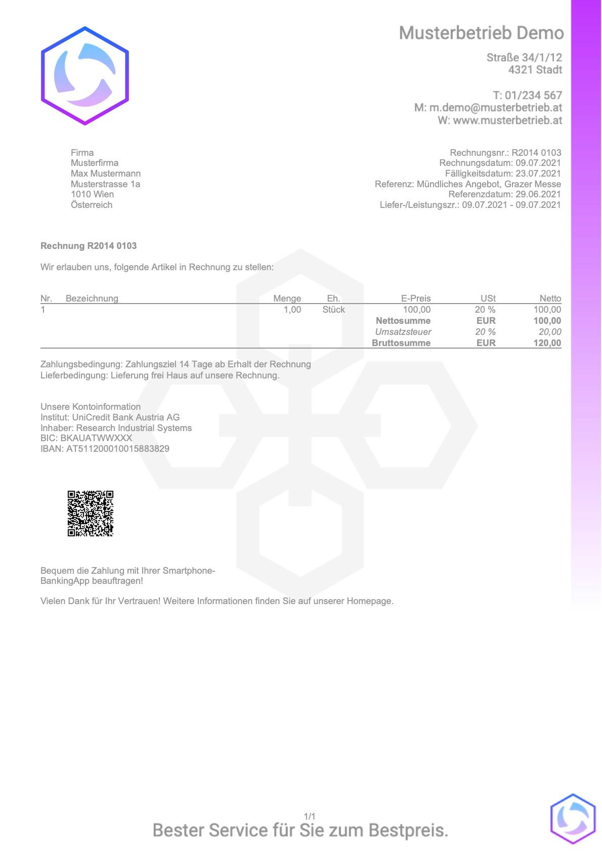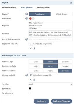 Fixes Layout: Der schnellste Weg zu Ihrer Rechnung. Die Detaileinstellungen wie Position (links, mittig, rechts) etc. kann im Tab Druckeinstellung im Block "Konfiguration" eingestellt werden. Konto- und Firmeninformationen, etc. können Sie in den Kopf- oder Fußzeilenbereich als Text eintragen. Die Größe des dargestellten Logos im PDF kann über die tatsächliche Bildgröße der hochgeladenen Bilddatei gesteuert werden.