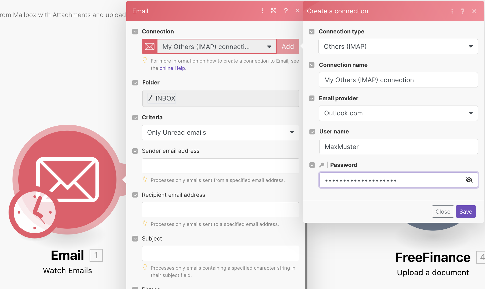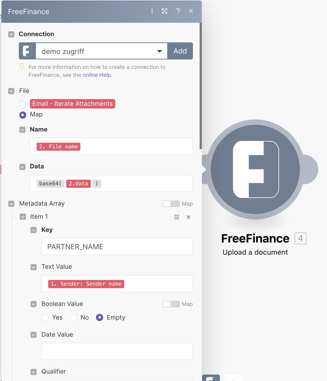 Finden Sie hier die notwendigen Infos über das automatische Importieren von Rechnungs-PDFs aus einem E-Mail-Postfach über die Schnittstelle make.com ins FreeFinance Doku-Archiv.