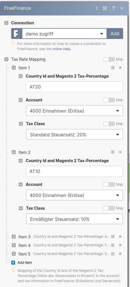Es können beliebig viele Magento 2-Steuersätze zu FreeFinance Konten und Steuersätzen gemapped werden.