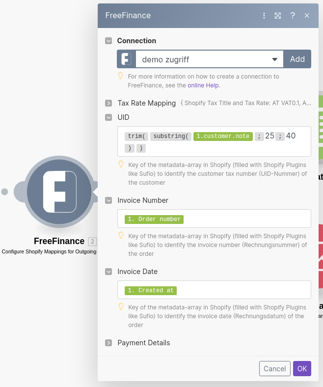 Das Mapping muss die Shopify Payment Method Code mit dem FreeFinance Buchhaltungskonto des Zahlungsmittels verbunden werden.