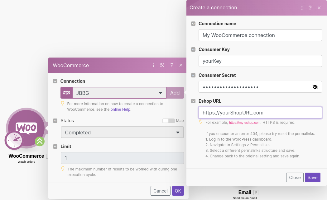 Einrichten der WooCommerce Verbindung mit den API-Keys - Details zu den API-Keys auch in der Make-Hilfe