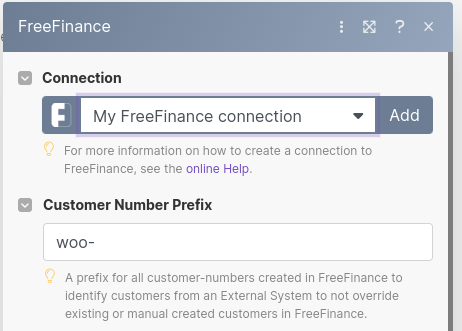 Beispiel: "woo_" - damit erhalten alle Kunden aus WooCommerce die Kundennummern "woo_1000", "woo_1001", ... in FreeFinance.