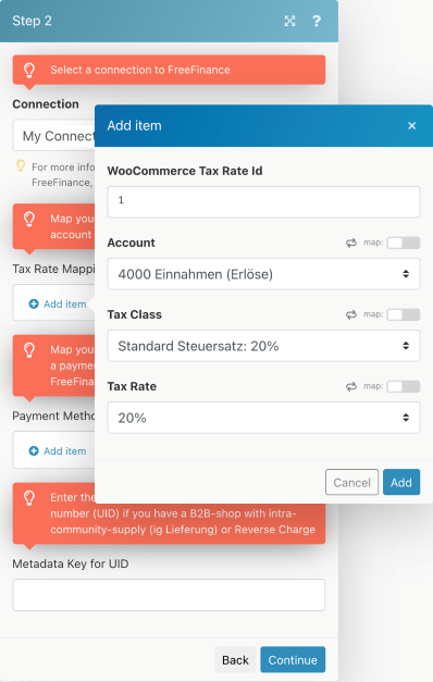 Das Steuermapping ist dafür da, die Steuersätze in WooCommerce mit den Konten und Steuersätzen in FreeFinance zu verbinden.