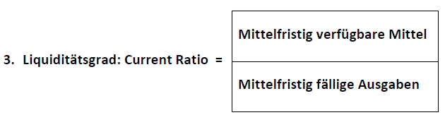 Bei dieser Messung des Unternehmens-Liquiditätsgrads werden die Aktiva beleuchtet. Es wird eruiert, inwiefern das Unternehmen durch sein Anlage- und Umlaufvermögen die im Zeitraum von typischerweise 12 Monaten (=ein Geschäftsjahr) fälligen Zahlungsverpflichtungen bedienen kann.
