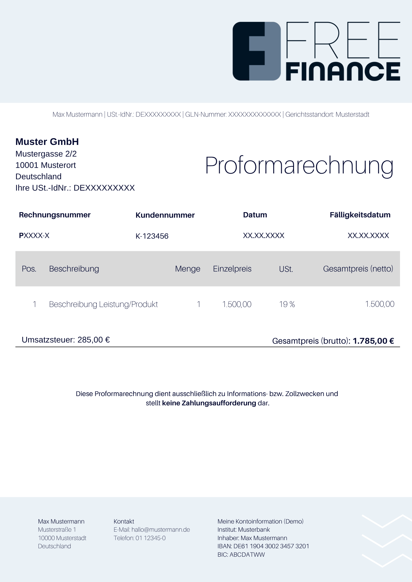 Abgesehen von diesen Angaben, unterliegt die Proformarechnung keinen gesetzlichen Vorschriften in Bezug auf Inhalt oder formelle Struktur.