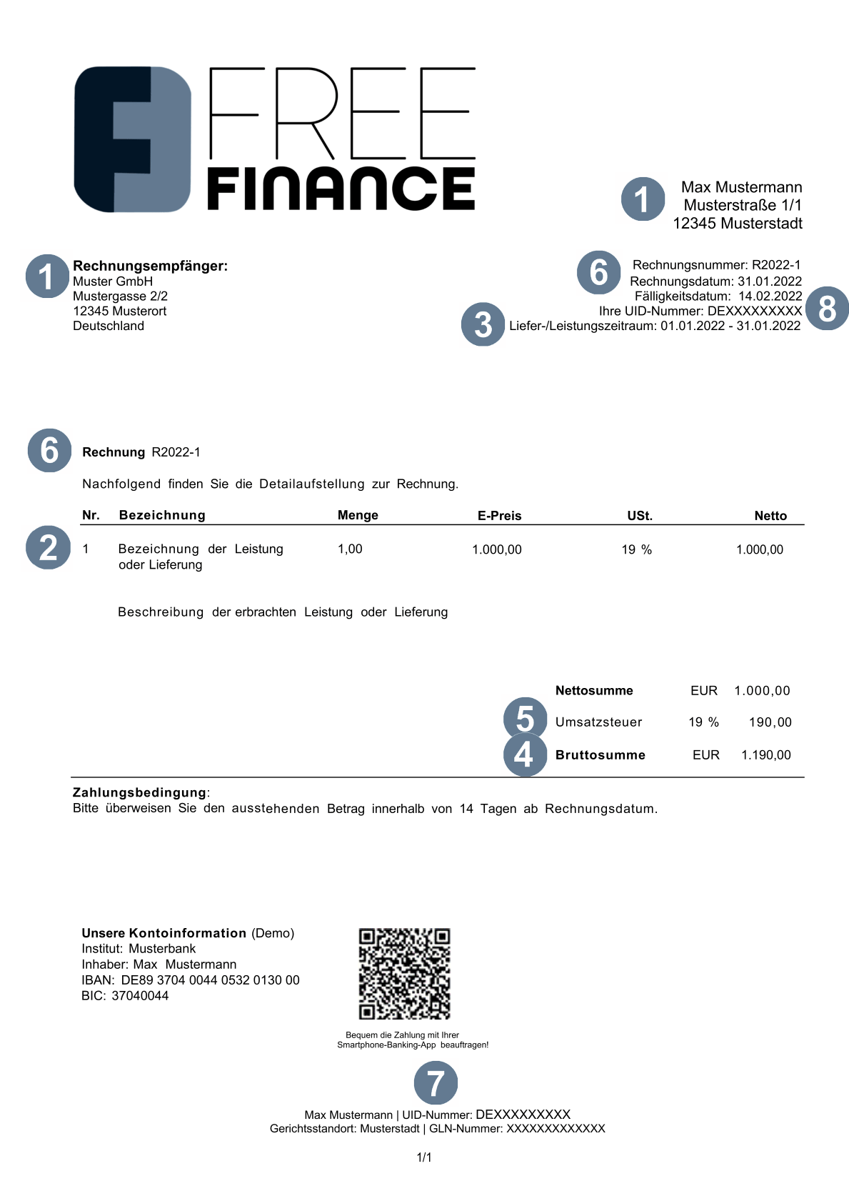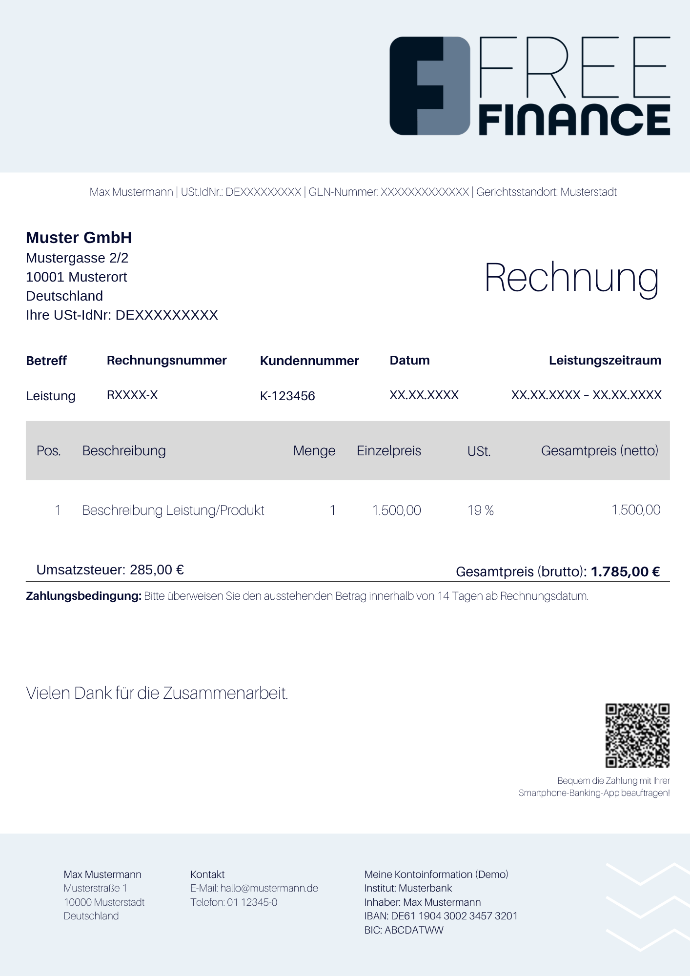 Bei Rechnungen, deren Höhe anhand des in Rechnung gestellten Betrags den Wert von 250 Euro überschreiten, müssen die gesetzlichen Pflichtangaben auf der Rechnung angegeben werden, damit diese auch vom Finanzamt akzeptiert wird: