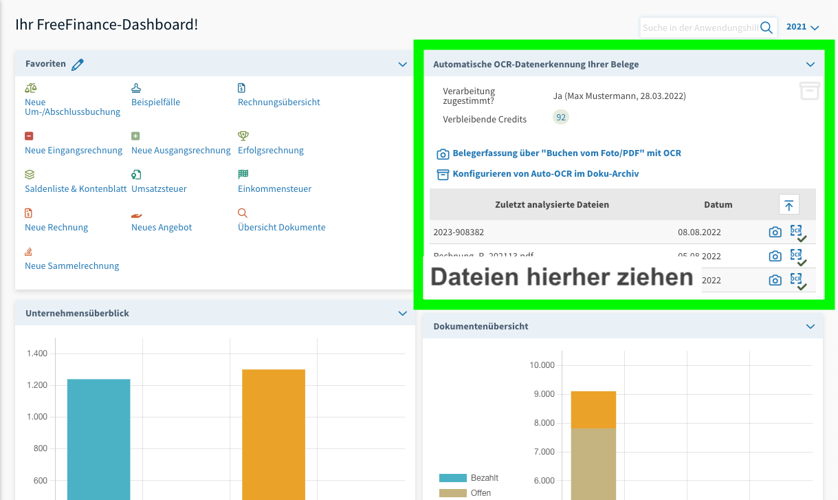 Tipp: Besonders praktisch ist es dann, wenn Sie schnell zwischendurch eine Rechnung per Mail erhalten und diese für die Bilderkennung hochladen möchten. Bei FreeFinance anmelden, Datei aufs Dashboard ziehen, später verbuchen.