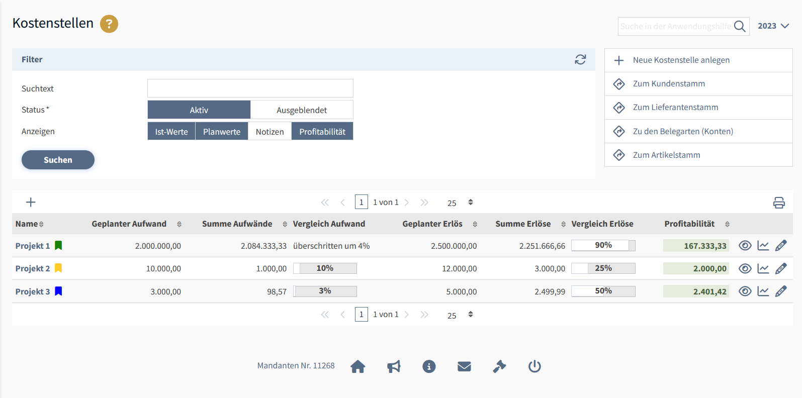 Planen und erfassen Sie sowohl Aufwände als auch Erlöse von verschiedenen Projekten, Kunden, Filialen etc. und behalten Sie einfach den Überblick über die Profitabilität Ihrer Tätigkeit.