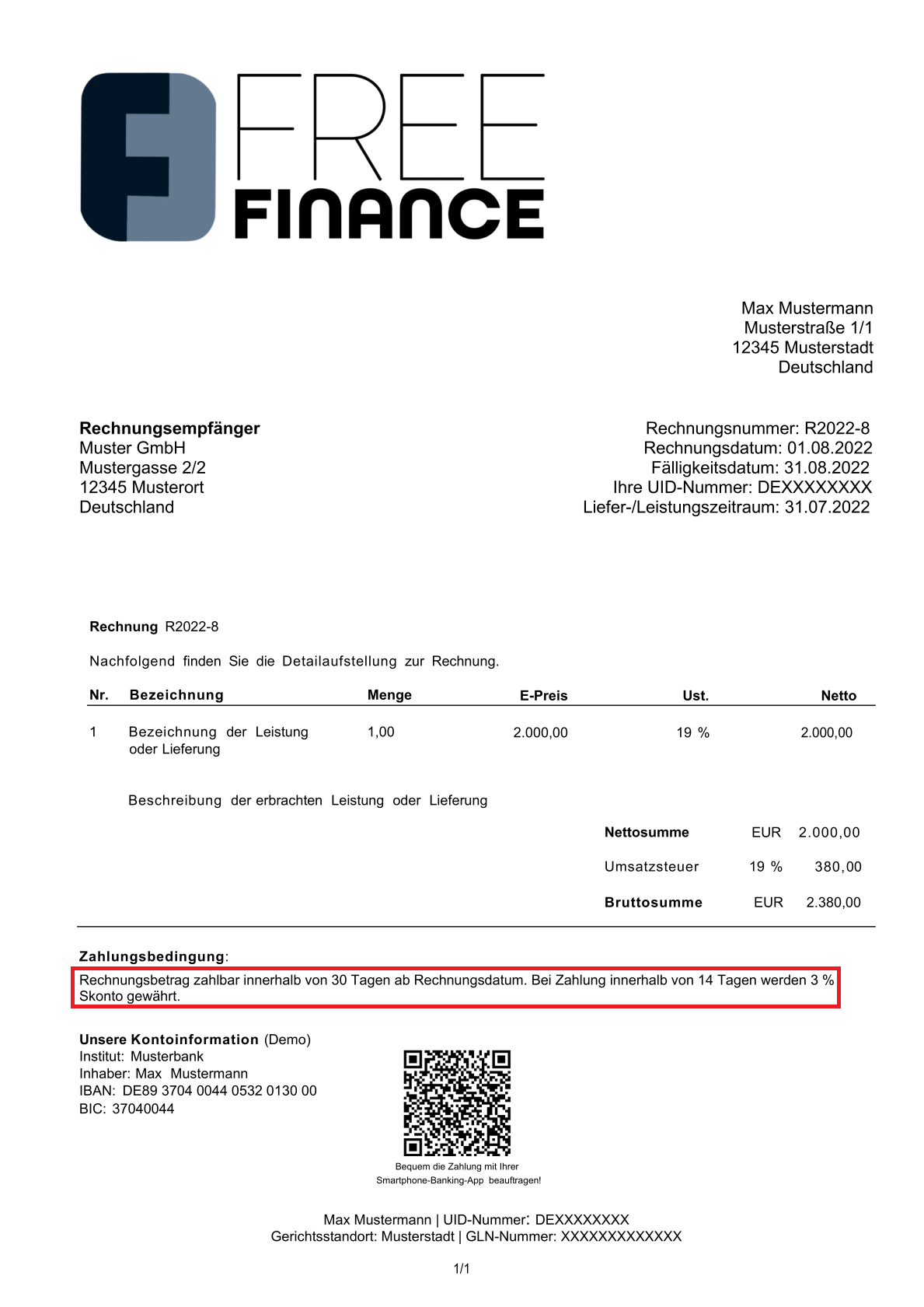 - Anhand einer Staffelung mit mehreren Fristen für die Skontosätze: Wenn die Rechnungsfrist insgesamt beispielsweise 30 Tage beträgt, kann eine Skontofrist für Nachlass im Ausmaß von 2 % bei Zahlung binnen 14 Tagen und ein Rabatt des Unternehmens in Höhe von 3 % bei Zahlung der Rechnung innerhalb von 10 Tagen angeboten werden.